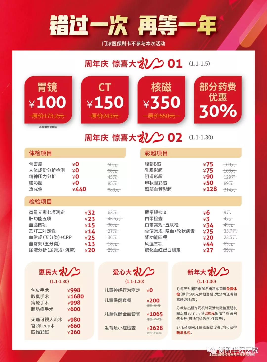 據(jù)醫(yī)院負責(zé)人介紹,本次活動從2019年元月1日開始到元月30日結(jié)束?;顒臃秶土Χ瓤芍^前所未有:大檢查、常規(guī)檢驗、藥費的巨惠推出讓患者想都不敢想,常見疾病的治療更是推出了包干價。這真讓老百姓體會到了既能少花錢又能治好病的實惠。