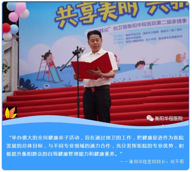 6月2號(hào)上午,由衡陽(yáng)市創(chuàng)衛(wèi)辦、衡陽(yáng)市衛(wèi)健委等單位主辦“共享美麗,共擁健康---‘衡陽(yáng)群眾’創(chuàng)衛(wèi)暨衡陽(yáng)華程醫(yī)院第二屆親情季‘健康行’”活動(dòng)在東洲島舉行,豐富多彩的健康娛教活動(dòng),向市民普及健康醫(yī)療、創(chuàng)衛(wèi)知識(shí)。