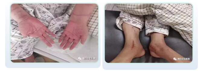 5月11日家屬通過朋友介紹將王某送入我院康復(fù)中心進(jìn)行康復(fù)治療,入院時(shí)經(jīng)康復(fù)??茩z查示:該患者精神差,極度抑郁,情緒低落、思維遲緩、不愿與外界進(jìn)行言語交流,不愿意配合檢查,不能獨(dú)坐,不能站立。左上臂、右上臂、左腕、右腕及頸部均可見患者幾天前自傷所導(dǎo)致的刀割傷口,傷口長約3-5cm不等。雙足足跟凹陷,右手拇指、食指缺失。雙下肢肌力2級,肌力差,雙下肢只能在床面平移,無法抬離床面。