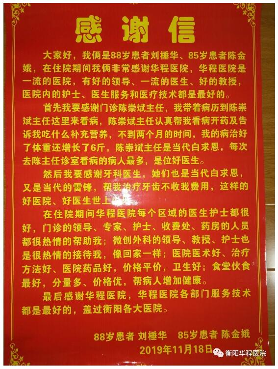 小編聽兩位耋耄老人說,目前因年事已經(jīng)高,身體有礙,出入醫(yī)院已經(jīng)成為兩人的“日?;顒?rdquo;了,9月初因為陳奶奶高血壓犯了,又一次進(jìn)了醫(yī)院,來華程醫(yī)院實是為了方便,不需要舟車勞頓,他們原以為在市區(qū)裝修這么好的一家醫(yī)院,收費一定很貴,誰想這一場病讓他們對醫(yī)院有了大大的改觀。
