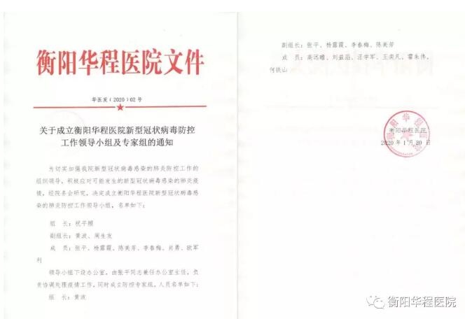 1月20日,院辦下發(fā)《關(guān)于成立衡陽華程醫(yī)院新型冠狀病毒防控工作領(lǐng)導小組及專家組的通知》成立由院長祝平照任組長,副院長黃波、周生友任副組長,醫(yī)務(wù)部、護理部、院感、門診客服部、后勤保障部、院辦公室負責人為成員的防控領(lǐng)導小組。領(lǐng)導小組專設(shè)辦公室由醫(yī)務(wù)部張平部長負責協(xié)調(diào)處理疫情工作,并成立防控專家組,專家組成員由呼吸肝病中心高遠瞻、主任助理王奕凡,急救中心主任劉益滔、急診科主任汪學軍ICU、內(nèi)科門診醫(yī)師霍朱偉、發(fā)熱門診醫(yī)師何鐵山組成。