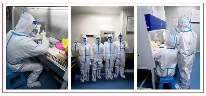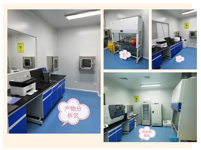 實驗室嚴格按照醫(yī)學生物安全實驗室建筑技術標準建設,采用標準化、合理分區(qū)負壓氣流設計,分為四區(qū)三通道。四區(qū)分別為試劑準備區(qū)、標本處理區(qū)、擴增區(qū)、產物分析區(qū);三通道分別為標本送檢通道、工作人員通道、污物通道;做到“各區(qū)獨立、注意風向、杜絕污染、方便工作”。PCR配備有:全自動核酸提取儀BK-HS96、實時熒光定量PCR分析儀Lepgen-96、醫(yī)用冷藏箱、高速臺式離心機、恒溫金屬浴、旋渦混勻器、Mini離心機、生物安全柜、潔凈工作臺、高壓滅菌鍋、紫外線消毒車、紫外消毒機等??蓪崿F(xiàn)單日單采檢測量1200人/次。