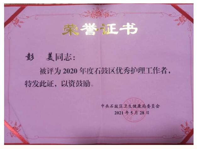 在工作中的十多年里,彭美曾多次被醫(yī)院評為先進(jìn)工作者 、優(yōu)秀護(hù)士,2018年被評為衡陽華程醫(yī)院“優(yōu)秀護(hù)士”榮譽(yù)稱號,2021年5月被評為2020年度石鼓區(qū)”優(yōu)秀護(hù)理工作者“ 稱號。這些榮譽(yù)既是對彭美工作的肯定,也是對她的更大鞭策。但成績屬于過去,未來的路任重道遠(yuǎn), 做為一名優(yōu)秀護(hù)士,彭美知道自己還需要做得更多,她將繼續(xù)努力,不斷進(jìn)取,做一名更加優(yōu)秀的護(hù)理工作者!